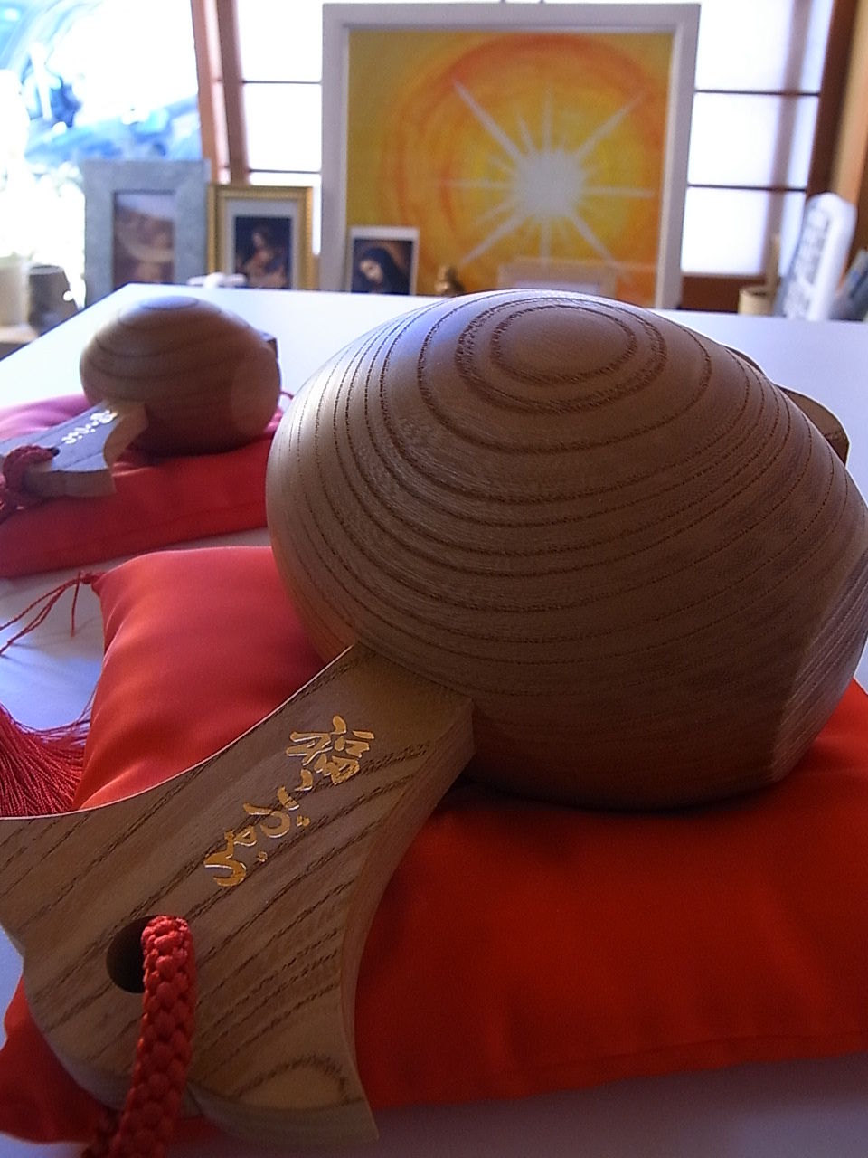 それぞれ、いかにも縁起の良い赤い座布団とワンセットで。