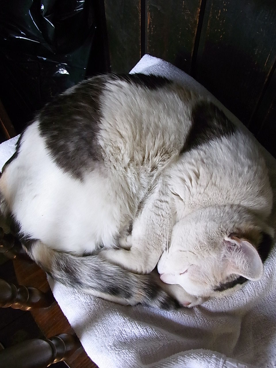 芋虫のように丸くなって、カウンター席で眠り猫。