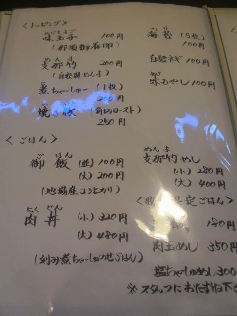 トッピングと、ご飯メニュー(チャーシューを使った丼は好評とのこと)。