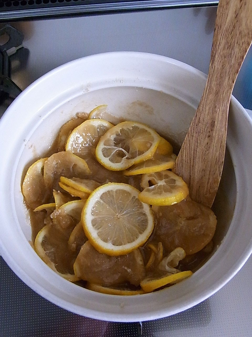 1.鍋にレモンと砂糖を入れて火を付ける(弱火)。